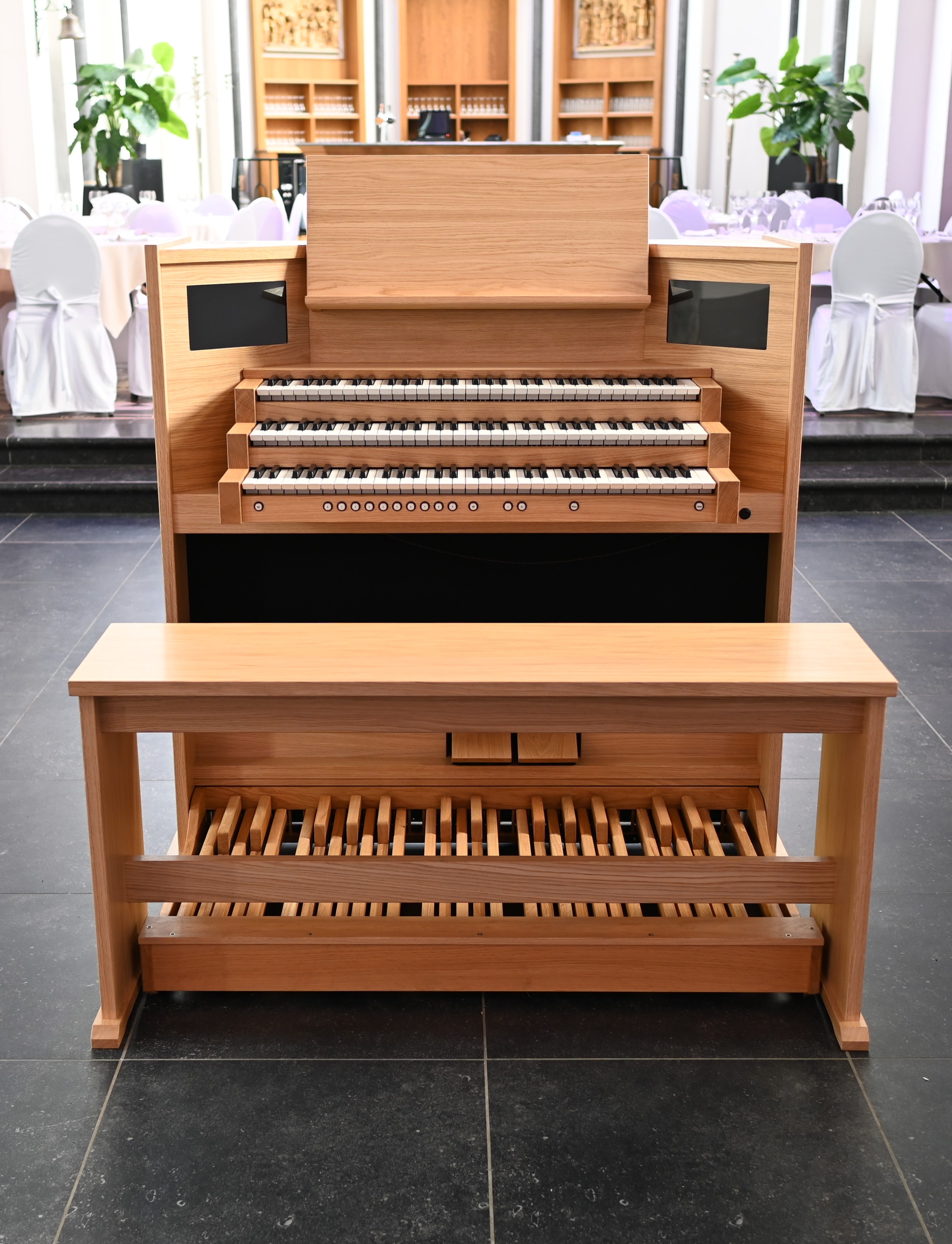 Introducing the new Mixtuur Duett III a compact three-manual organ housed in a beautifully crafted oak cabinet. Its two 10-inch touchscreen displays are angled towards the player, providing an intuitive way to control the sample sets of Hauptwerk™ or Sweelinq. Thanks to the innovative placement of five high-quality speakers, three digital amplifiers, and a powerful computer system, the Duett III delivers an unparalleled playing experience.
